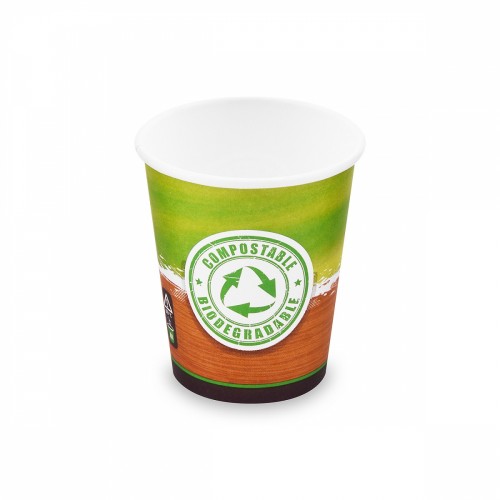 Papierový pohár s potlačou (PAP / C-PLA) vyrobený zo 100 % celulózy a bioplastu, odolnosť do 80 °C, vhodný na teplé nápoje. Využitie pre gastronomické zariadenia, fast foody, bufety, jedálne, na večierkoch, kde sa podáva catering, na festivaloch, koncertoch, oslavách, záhradnej party a v domácnostiach. Bio materiál PAP - 100% celulóza z čerstvých papierových ekologických vlákien s bariérou proti nasiakavosti. Materiál je cennou surovinou v cyklickom hospodárstve recyklácie, rozložiteľný a vhodný pre styk s potravinami. Bio materiál PLA, C-PLA - Polylactic acid alebo kyselina polymliečna je bio plast vyrábaný z rastlinného škrobu s podobnými vlastnosťami ako plasty vyrábané z ropy. Tento plast je biologicky rozložiteľný, jeho základnými surovinami sú kukurica, cukrová trstina, rastlinný olej a je oveľa šetrnejší k prírode a životnému prostrediu ako bežné plasty z ropy.